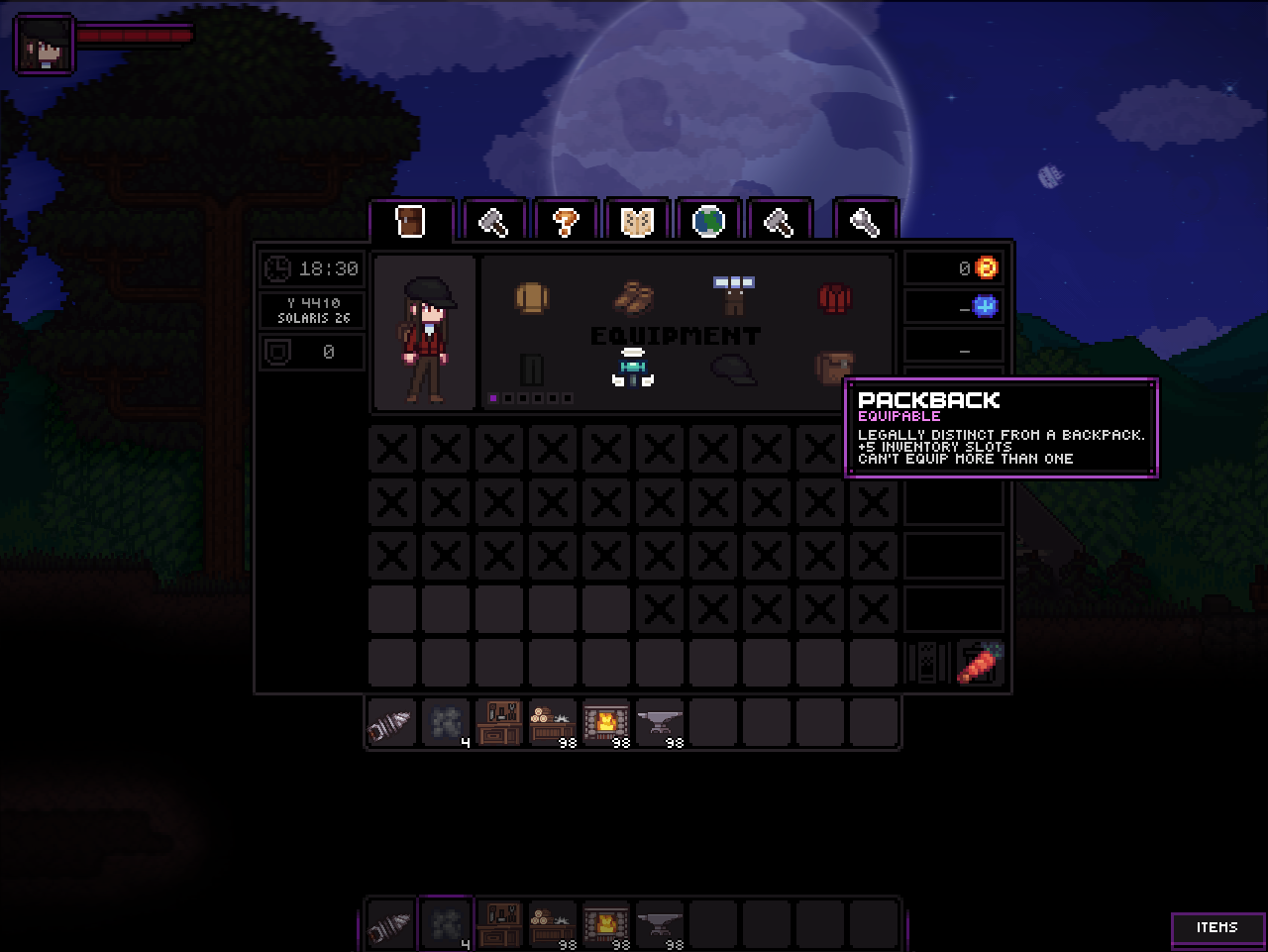 Structures, biomes, planets, parallaxes, starsystems, furniture, crafting, clothing, items, mobs, tiles — all are entirely data‑driven, and you can create your own content packs. Dungeon creation and testing tools are built into the game.